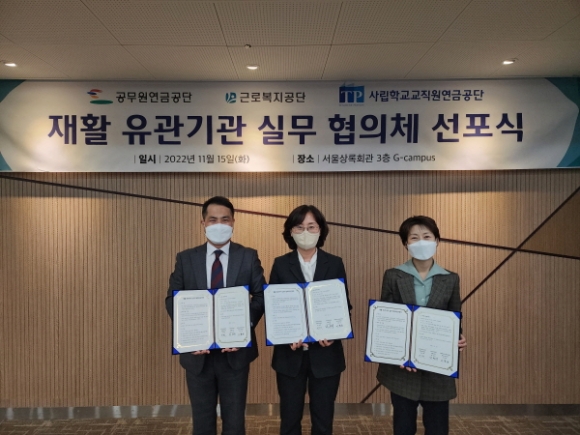 |  | | | ⓒ 김천내일신문 | | 공무원연금공단(이사장 황서종)과 근로복지공단(이사장 강순희) 및 사립학교교직원연금공단(이사장 주명현)은 지난11월15일 공무원연금공단 서울상록회관에서 재활서비스 협업기반 조성을 위한 실무협의체를 구성했다. 「재활 유관기관 실무협의체」는 업(직)무상 재해 이후 사회복귀를 위한 재활의 현안사항 공유 및 발전방향 모색을 위해 마련된 실무자 위주의 정기 회의체이다. 3개 기관은 지난 6월부터 ‘맞춤형 재활 사례관리’, ‘재활급여의 이용활성화’, ‘데이터 기반 재활서비스 운영’ 등 다양한 주제를 함께 논의하면서 협의체 발족에 대한 공감대를 형성해 왔다. 실무협의체 구성을 계기로 각 기관 재활사업 담당 실무자가 만나는 자리를 정례화한다. 이를 통해 재활 성공사례·노하우 등을 상호공유하고, 재활사업 현안에 대한 공동 협력방안을 적극적으로 모색해 나갈 계획이다. 이번 협의체 마련의 주관기관인 공무원연금공단 재해보상실장은 “앞으로 기관 간 더욱 활발한 교류를 통해 재해를 입은 공무원과 근로자가 건강하게 직무에 복귀할 수 있도록 지원하겠다”고 밝혔다. |