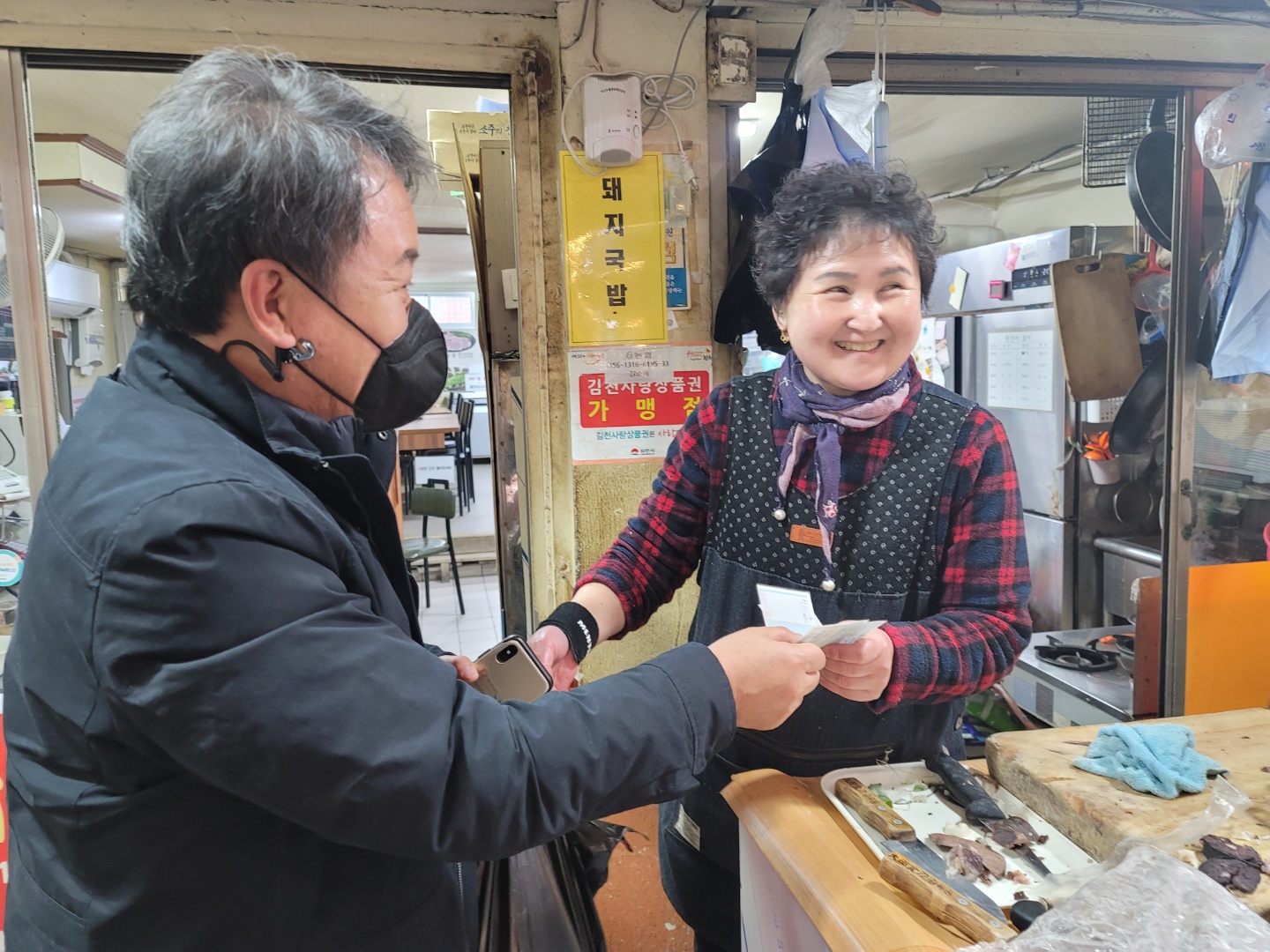 이번 행사는 코로나 19 장기화로 위축된 민생경제 회복과 전통시장 활성화를 위해 진행하게 되었으며, 지례면 직원들은 미리 구입한 김천사랑상품권으로 농산물 및 생필품 등을 구매했다.