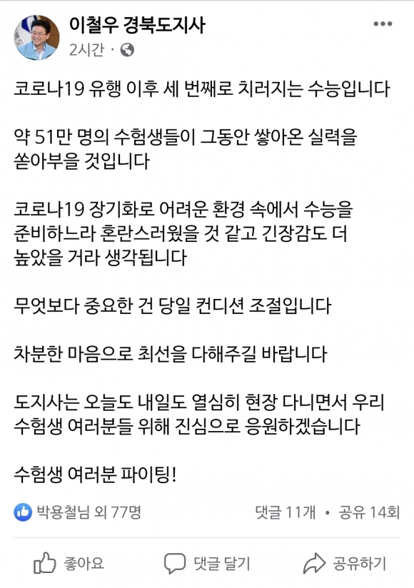 | 이철우 경북도지사는 11월 16일 페이스북을 통해 대입수학능력시험과 관련해 격려의 메시지를 남겼다.
