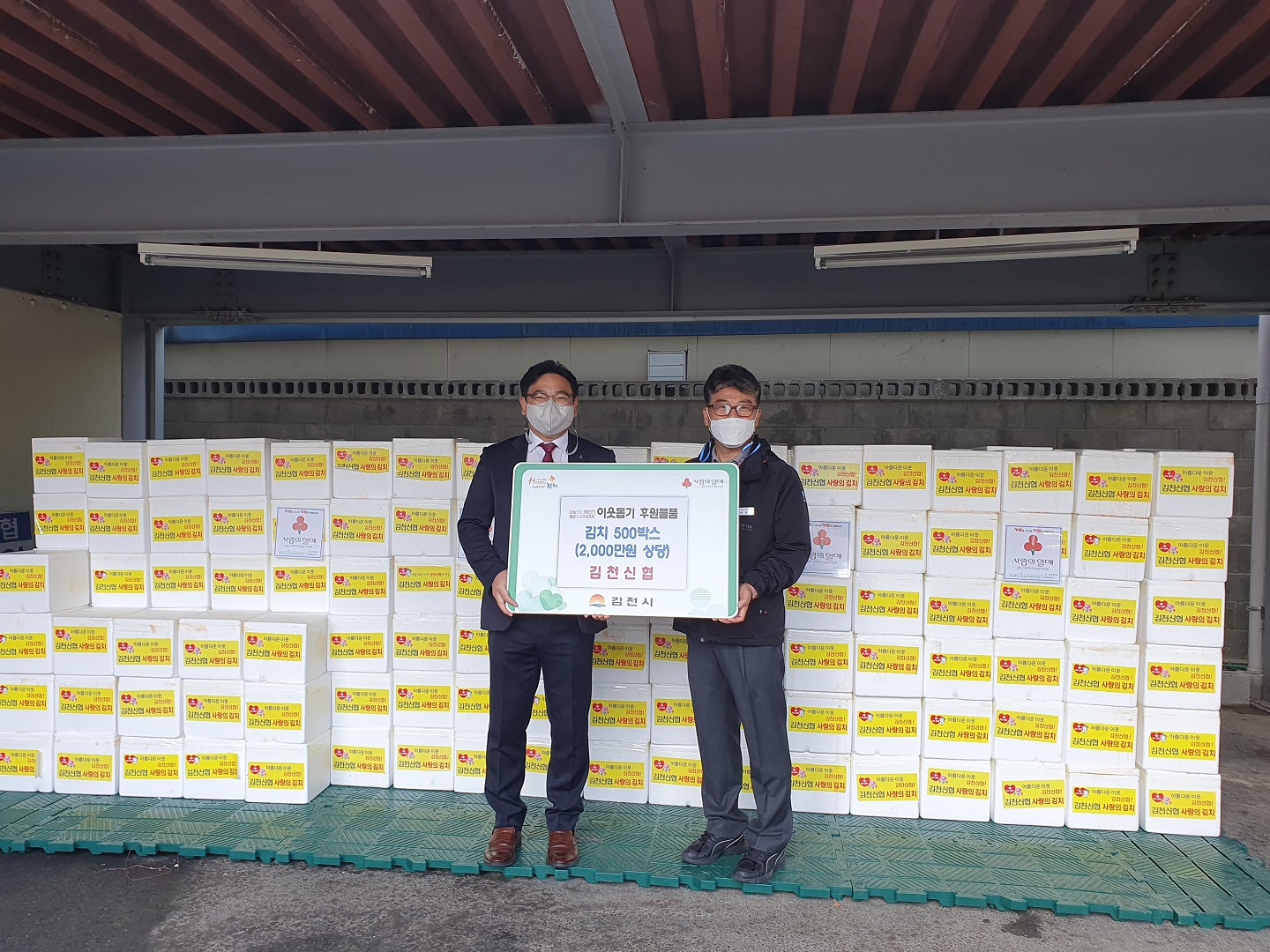 | 김천시(시장 김충섭)는 지난 11월 21일 김천신협(이사장 최윤애)으로부터 김장김치 7kg 500박스(싯가 2천만원 상당)를 전달받았다고 밝혔다.