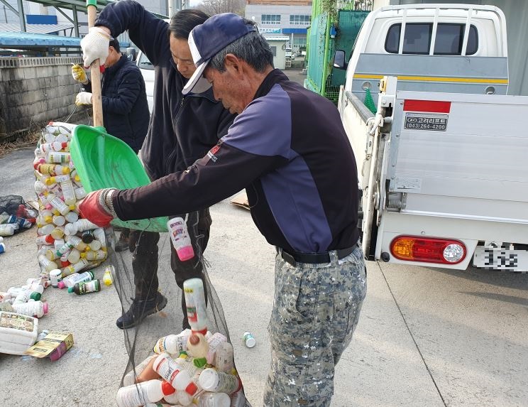 이날 활동에는 새마을회원 20여명이 참석한 가운데 관내 18개 마을의 새마을지도자들은 트럭을 이용해 각 마을에서 수거한 폐농약병을 새마을협의회 사무실 앞 공터에서 폐농약병 2t정도 분리작업을 실시했다.
