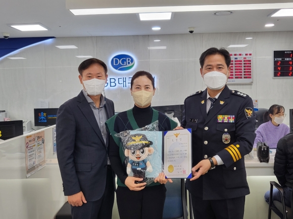 | 김천경찰서(서장 김기대)는 11월 23일 대구은행 김천지점을 방문해 전화금융사기 예방에 기여한 직원에게 표창장을 수여했다.