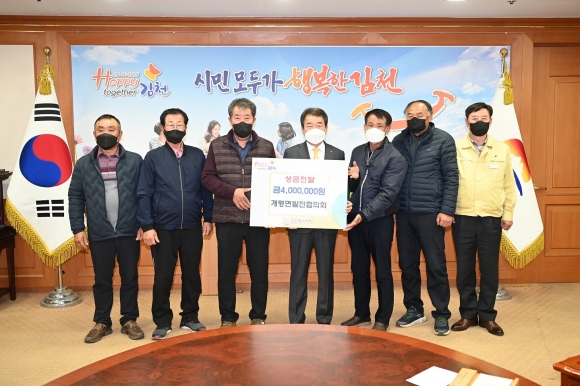 | 김천시 개령면 발전협의회(위원장 안진규)는 지난 11월 25일 관내 경제적 어려움을 겪는 이웃을 위해 김천복지재단에 성금 400만원을 기탁했다.