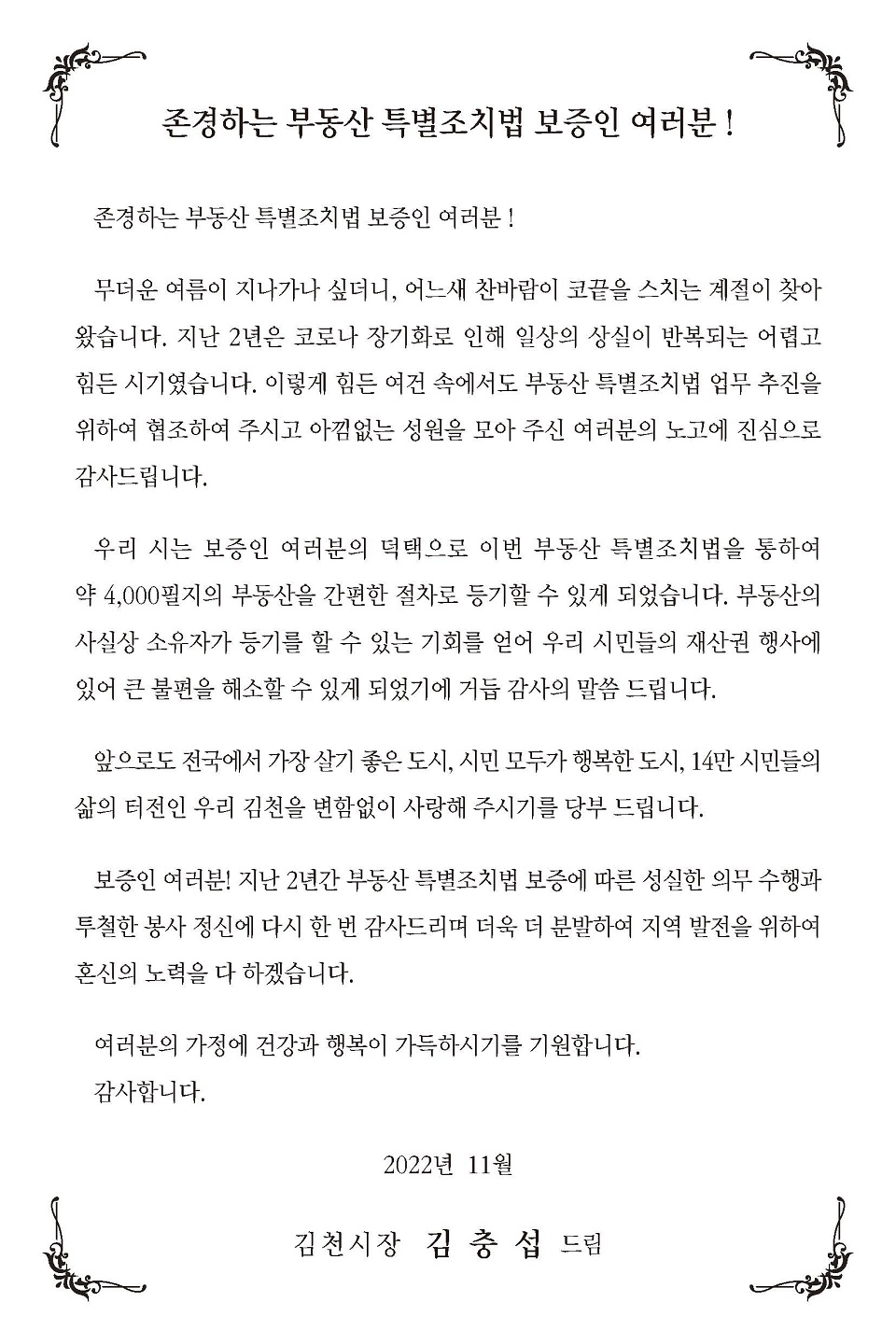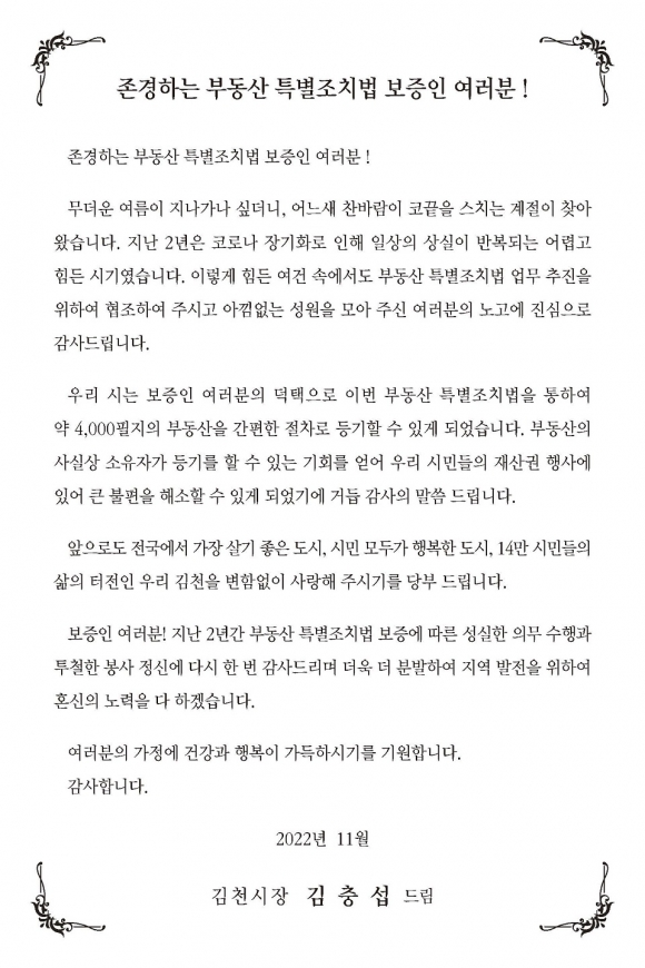 김충섭 김천시장은 서한문을 통해 “지난 2년간 코로나 장기화로 힘든 여건 속에서도 부동산 특별조치법 업무 추진을 위해 아낌없는 성원을 모아 주셔서 감사하다”라며 “보증인 여러분의 성실한 의무 수행과 투철한 봉사정신 덕분에 개인 재산권 행사의 불편함을 해소할 수 있었다”라고 보증인들의 노고에 깊은 감사함을 전했다. |