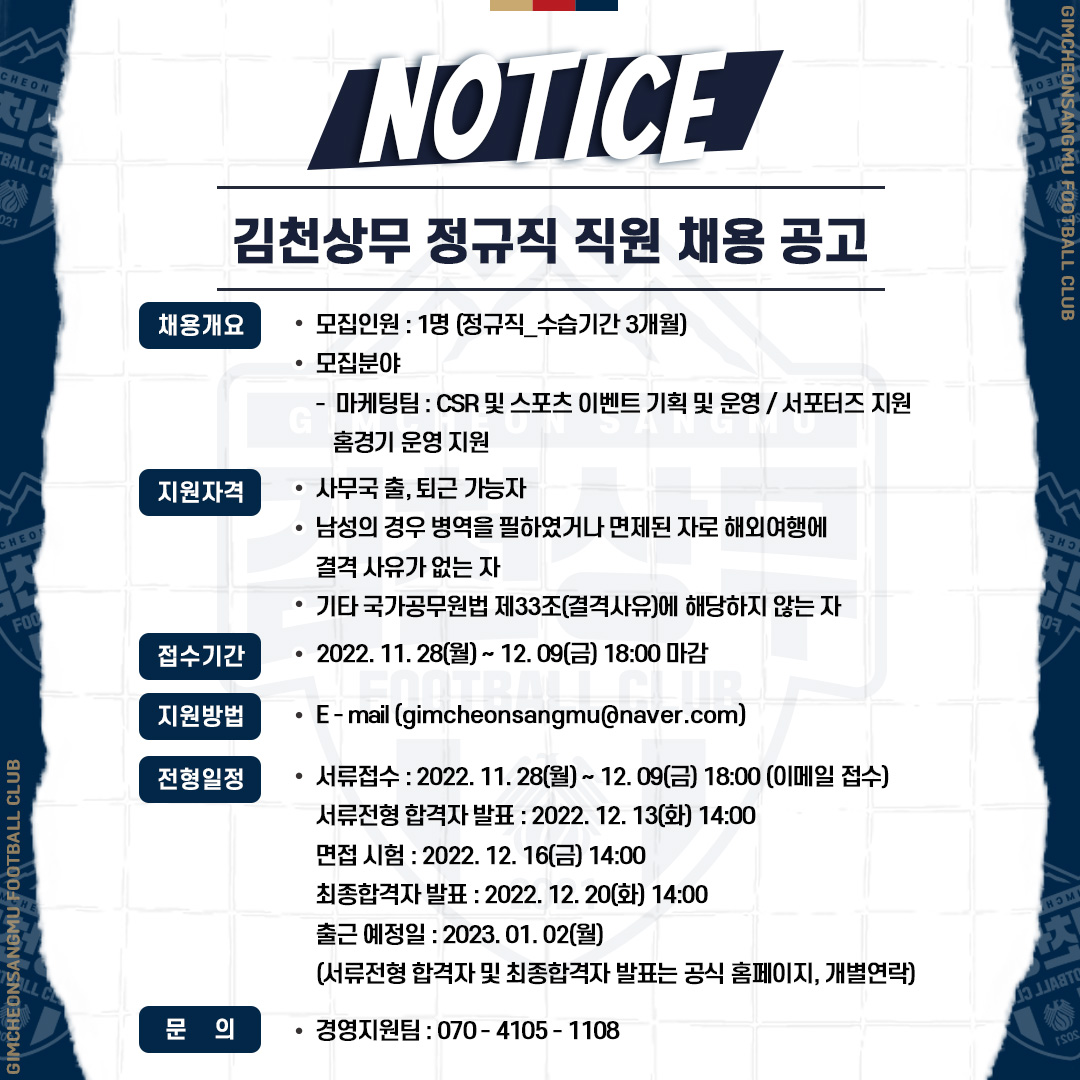 | 김천상무가 2023시즌을 함께할 정규직 직원을 공개 채용한다.