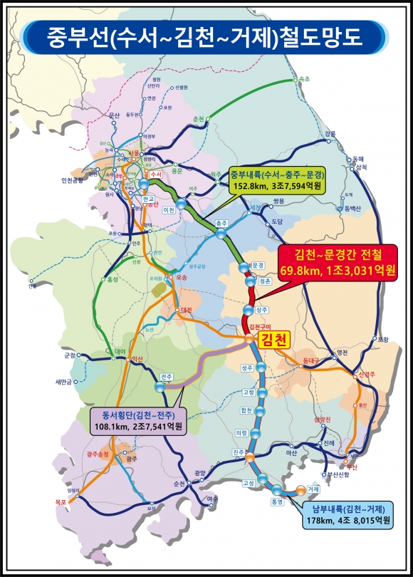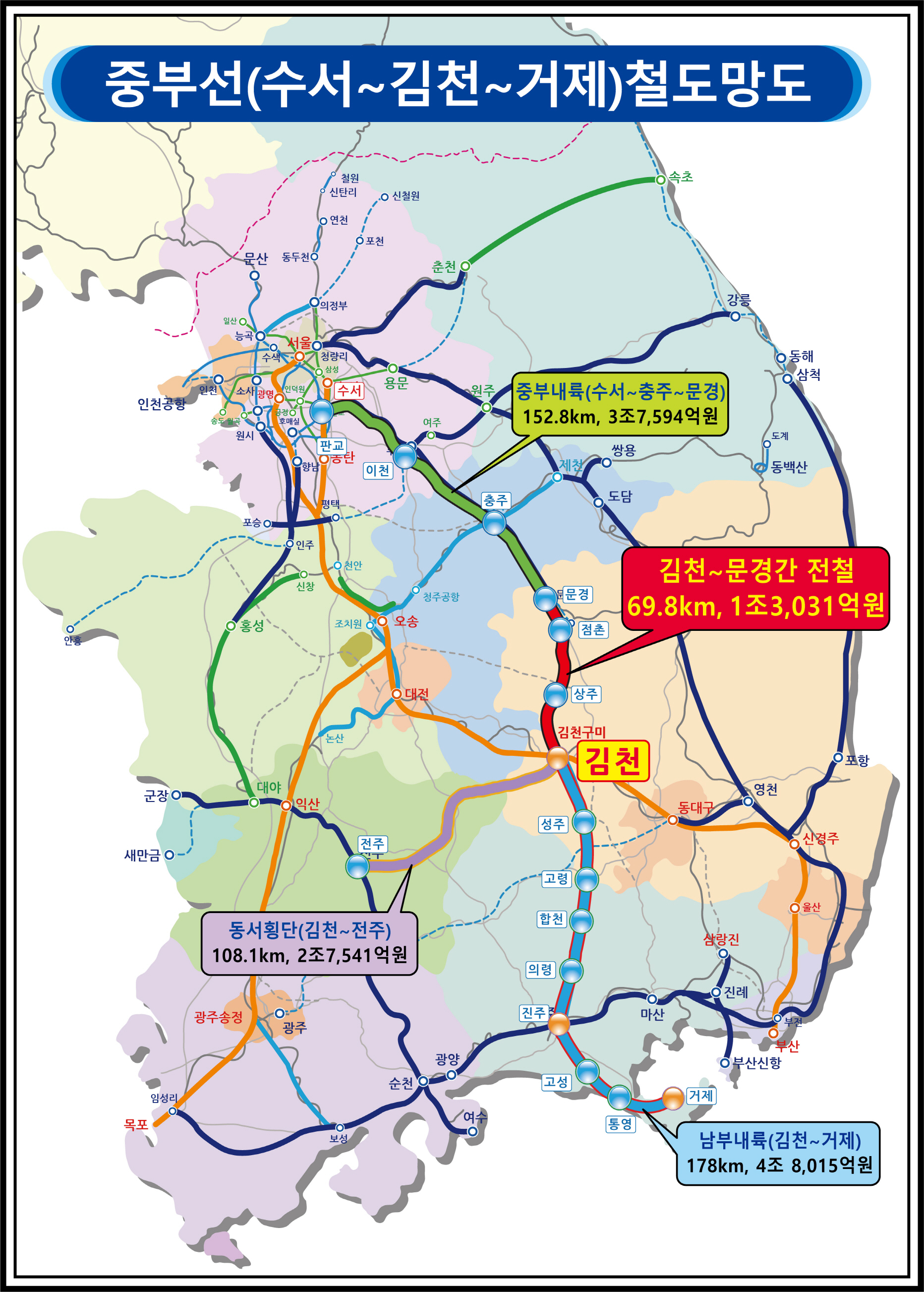 | 중부내륙(김천~문경)철도는 단순히 김천과 문경을 잇는 철도를 넘어 대한민국 중부내륙의 관문이자 중심 철도 축으로 중부내륙철도가 개통되면 김천에서 서울, 수서, 부산, 거제, 울산, 마산을 환승 없이 갈 수 있다. 중부내륙철도는 김천이 철도이용객 및 물류가 모이는 집결지로서의 위상을 더 높이는 핵심 노선으로, 전국 2시간대 생활권 중심도시로의 전초도시로 자연스레 고속철도를 이용하는 인근 시‧군 이용객들이 김천역을 이용하여 유동인구가 증가해 경제, 문화, 관광 활성화도 기대된다.
