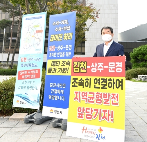 | 김충섭 김천시장은 미래 김천의 발전 동력이 고속철도라 확신하고 그 전초 단계가 남부내륙철도에 이어 중부내륙철도가 될 것이며, 두 대형 철도 사업이 확정되면 김천역이 철도 환승 및 집결지로서의 위상이 높아져 동서횡단(김천~전주)철도와 대구광역권철도(2단계, 김천 연장)도 자연스레 추진 될 것이란 판단 하에, 중부내륙철도 예비타당성 통과에 총력을 기울여 왔다. 2020년 7월 29일 청와대를 방문하여 철도 통과노선(김천, 상주, 문경) 지역주민 80%에 해당하는 244,734명의 염원을 담은 탄원서를 직접 전달하고 송언석 의원이 주최한 정책토론회에 참석해 사업의 필요성을 피력, 2021년 10월 14일 기획재정부, 국토교통부, 한국개발연구원 등 중앙부처에 호소문을 제출 했으며, 2021년 10월 5일 예비타당성 조속 통과를 위한 KDI(한국개발연구원) 1인 피켓 시위를 시의회 의장, 시의원, 시민단체 대표와 강행 하는 등 사업의 조속추진을 위한 지역의 간절한 바람을 지속적으로 건의 해 왔다.