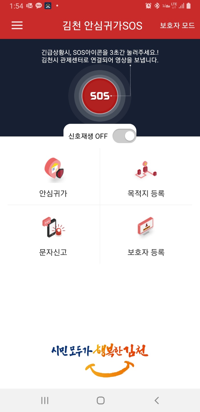 김천 안심귀가 SOS 서비스란 위급한 상황 발생 시 스마트폰 앱을 실행하여 김천시 통합관제센터와 보호자에게 피보호자의 위치와 스마트폰 영상을 전송하여 알림으로써 범죄와 안전사고에 긴급 대처하기 위한 서비스다. 또한 지역 내 설치된 2,000여 대의 방범용 CCTV와 연계하여 시민의 안심귀가를 도울 예정이다.