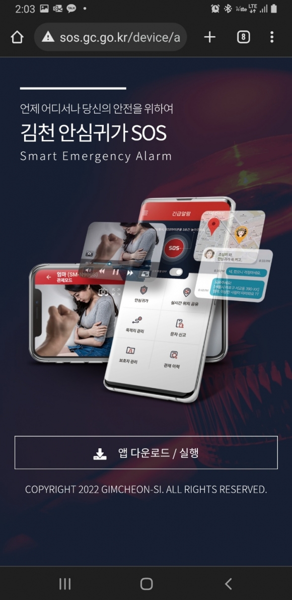 | 김천시에서는 통합관제센터에 스마트 안심귀가 시스템을 구축하고 스마트폰 앱을 활용한 ‘김천 안심귀가 SOS 서비스’를 11월 시범운영 후 12월 전면 시행할 예정이다.