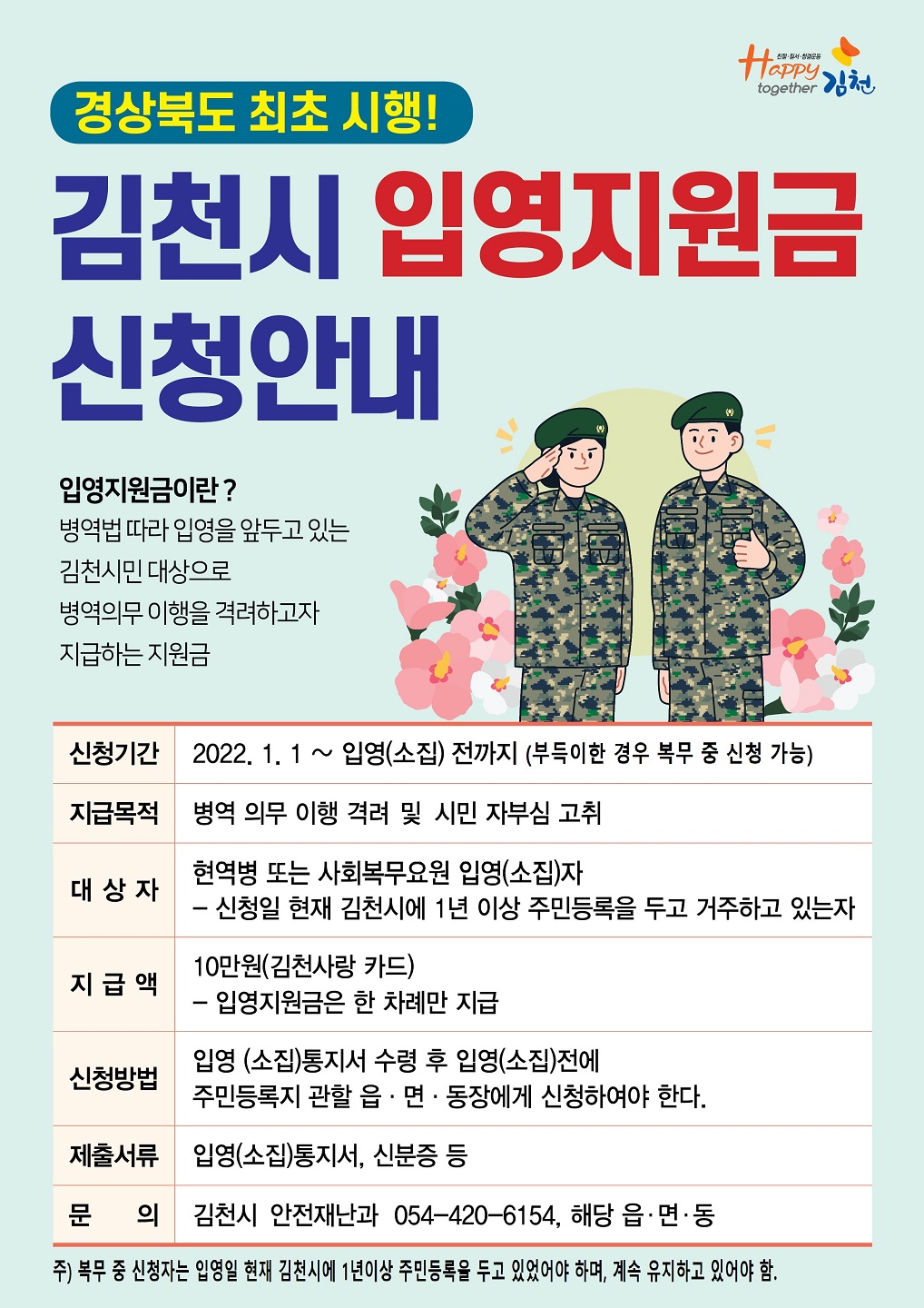 김천시, 현역병 또는 사회복무요원 입영지원금 신청하세요