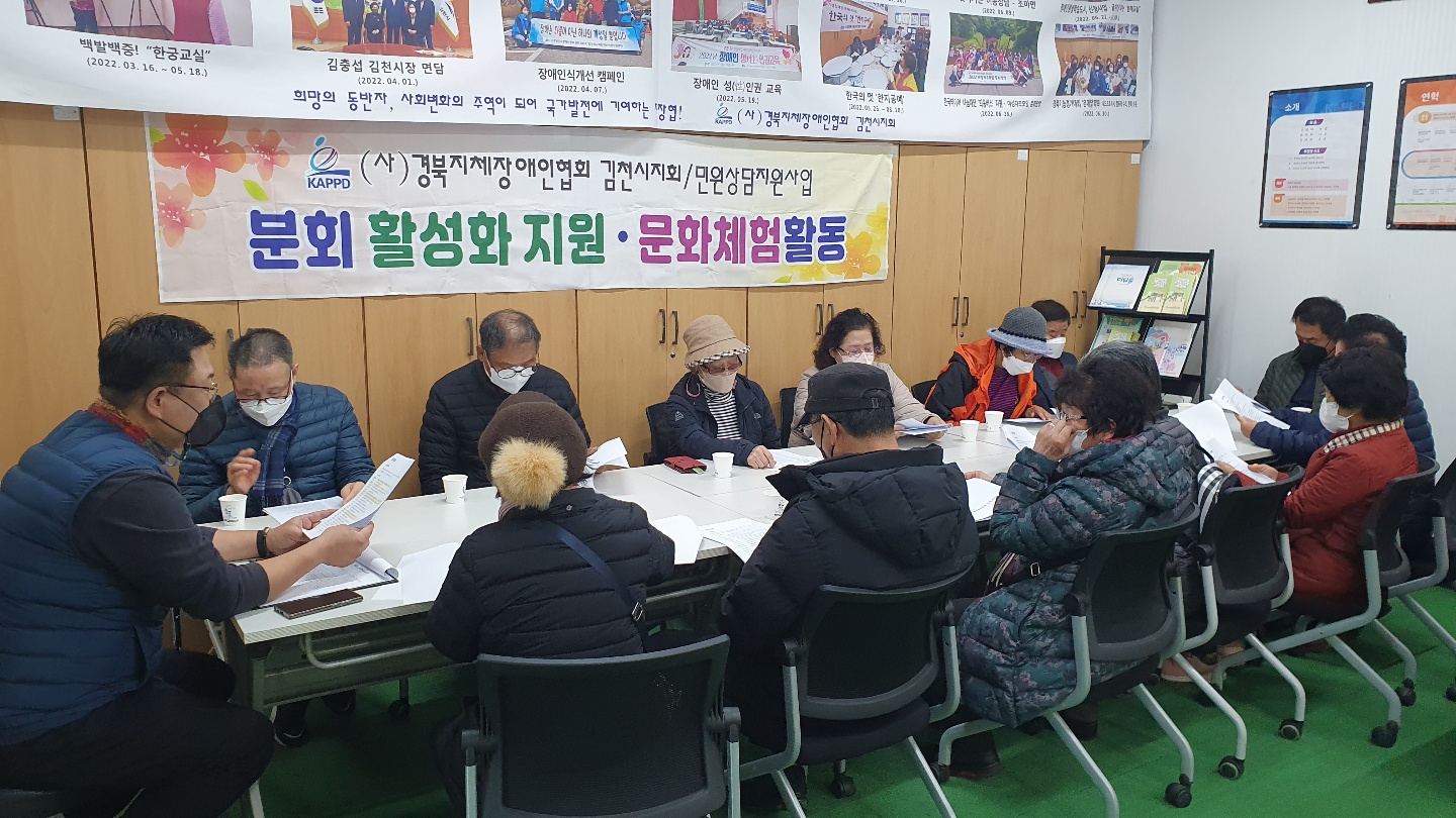 | (사)경북지체장애인협회 김천시지회(지회장 박희만)는 11월 29일 신음동 회원들 대상으로 분회 회원들 간의 정보를 교류하고 의견을 나누는 “분회 활성화 지원 사업”을 실시하였다.