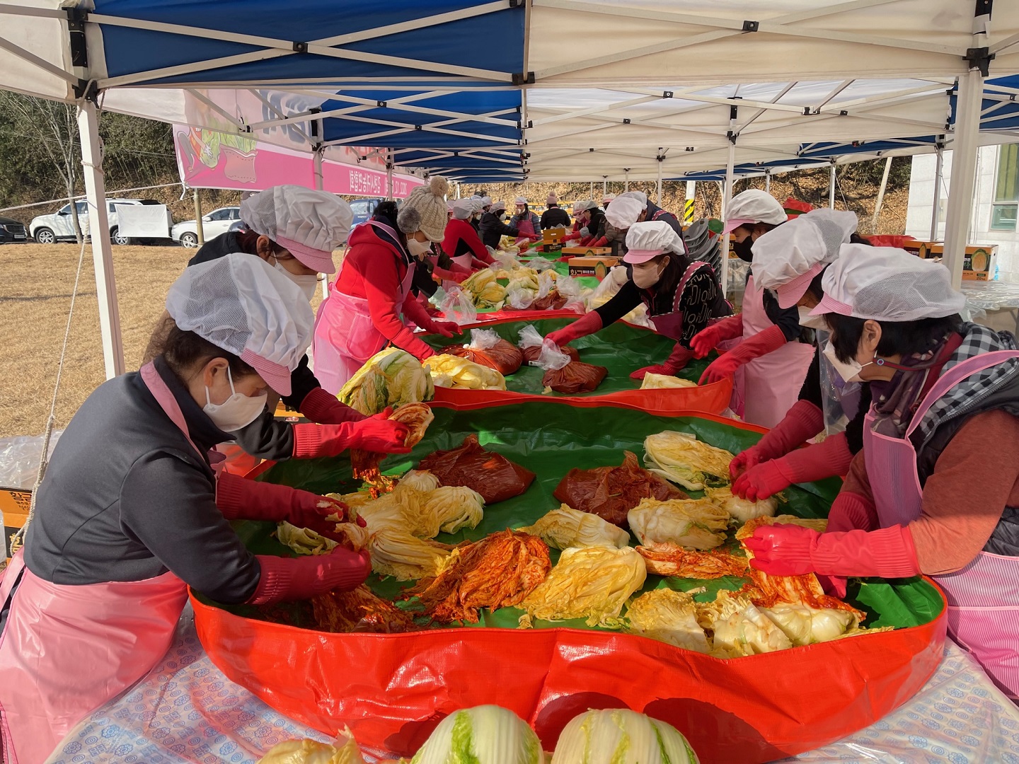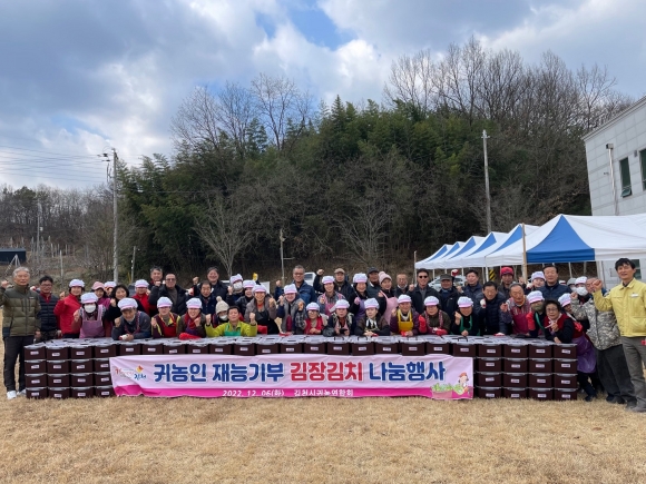 | 김천시귀농연합회(회장 김형동)는 지난 12월 6일(화) 농업기술센터에서 회원 50여 명이 지역사랑 실천을 위한 김장 나눔 봉사활동을 진행했다. 이번 행사에서는 1,400㎏의 김치를 담갔으며, 쌀 소비 촉진 운동의 일환으로 떡국떡 1㎏과 김치 4.5㎏씩 관내 독거노인 및 취약계층 300가구에 전달했다.