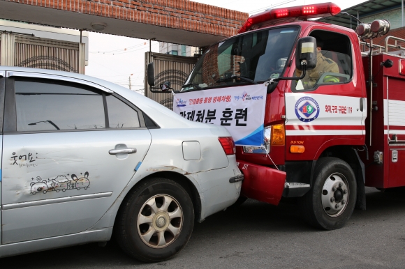 이날 훈련은 좁은 진입로 및 소화전 주변 불법 주·정차로 인한 소방활동에 방해가 되는 상황을 가정해 △통행장애를 초래하는 차량에 대한 강제돌파 △불법 주·정차 이동조치 △창문파괴를 통한 소방용수 확보 등으로 진행 됐다.