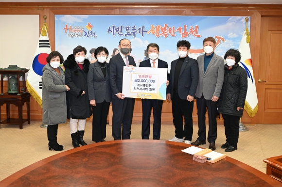 김충섭 김천시장은 “큰 금액을 기꺼이 기탁해주신 정병기 회장님과 회원 여러분들께 깊은 감사의 말씀을 드린다. 성금이 꼭 필요한 분들에게 전달될 수 있도록 하겠다.”고 전했다.
