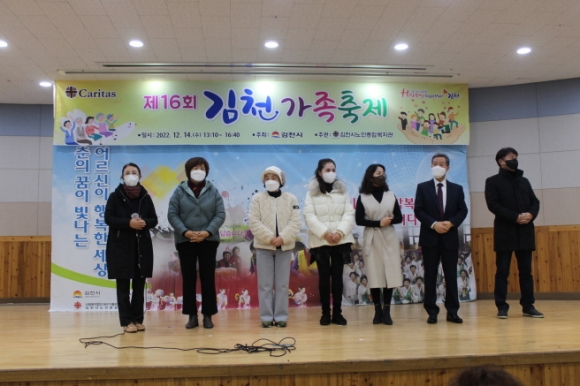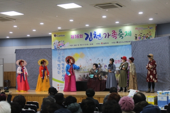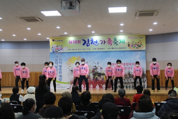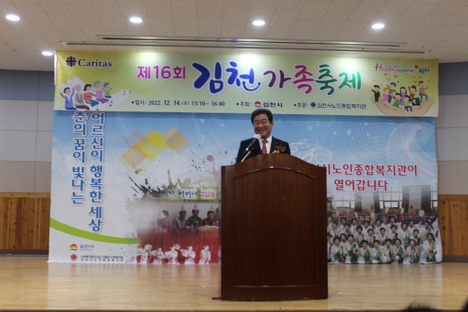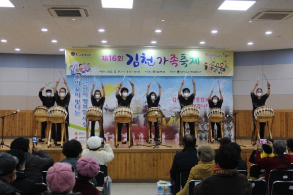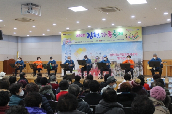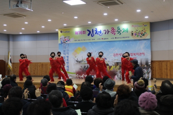 |  | | | ⓒ 김천내일신문 | | 김천가족축제는 어르신들이 1년간 김천시노인종합복지관에서 배우고 활동한 것을 발표하는 자리로서 올해로 16회를 맞이하며 노인복지회관에서 지난 12월14일 열렸다. 1부에서는 연극 ‘홍도야 울지마라’ 발표를 시작으로 개회식과 복지관 홍보영상 시청, 요요 클럽·예술단(기타, 한국무용, 우리춤, 모듬북) 발표회의 신나는 무대가 진행되었다. 개회식에는 김충섭 김천시장, 박선하 경북도의원, 최병근 경북도의원, 이승우 시의회 운영위원장, 박대하 산업건설위원장, 박복순 시의원이 참석했다. 김민종 관장은 인사 말을 통해 지역사회와 어르신 복지 증진을 위해 노력하는 모든 분들에게 감사의 마음과 어르신들과 직원의 마음이 질투, 불신하는 마음보다는 감사, 신뢰, 칭찬하는 마음으로 채워졌으면 좋겠다고 전하고 지역사회 어르신들에게 다양한 복지서비스를 제공 할 수 있도록 노력하겠다고 덧붙였다. 이어서 2부에는 노년사회화교육의 장구민요, 덩더쿵, 라인댄스, 신바람건강체조의 발표회가 진행되고 3층에서는 어르신들이 직접 그리고, 만든 작품들을 전시하며 지역주민과 어르신들이 관람 할 수 있도록 하였다. 그동안 코로나19로 많은 어르신들이 함께 하지 못하였지만, 제16회 김천가족축제는 많은 어르신들과 함께 할 수 있어 뜻깊고 의미 있는 시간이었으며 2022년 한 해 동안 열심히 활동하신 우리 복지관 어르신들에게 큰 박수와 응원을 당부했다. |  | | | ⓒ 김천내일신문 | |