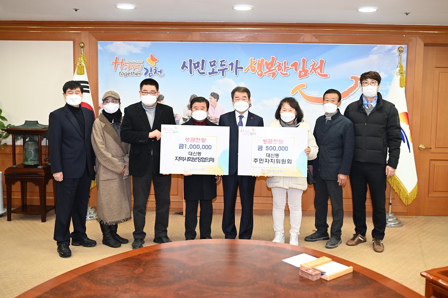 | 대신동 주민자치위원회(위원장 최규탁)와 대신동 지역사회보장협의체(위원장 문장훈)은 12월 20일 김천시청을 방문하여 지역의 어려운 이웃에게 써달라며 김천복지재단에 성금 150만원을 기탁했다.
