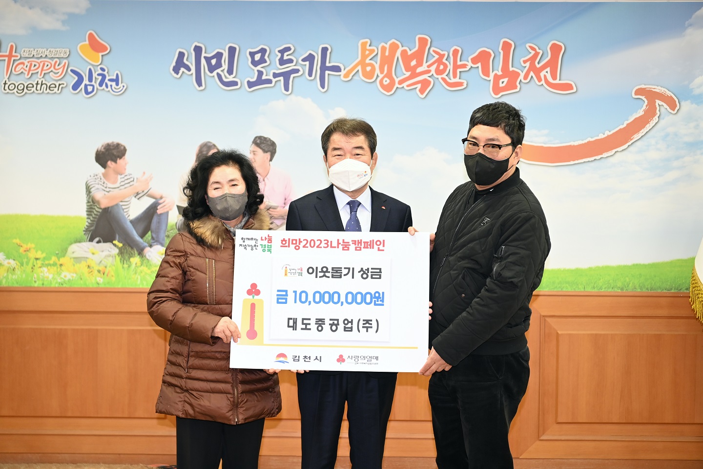 김충섭 김천시장은 “우리 지역의 저소득층을 위해 소중한 나눔을 실천해 주신 대도중공업 대표님께 깊은 감사를 드린다. 따뜻한 온정이 담긴 성금은 관내 어려운 이웃을 위해 소중하게 사용하겠다.”고 밝혔다.
