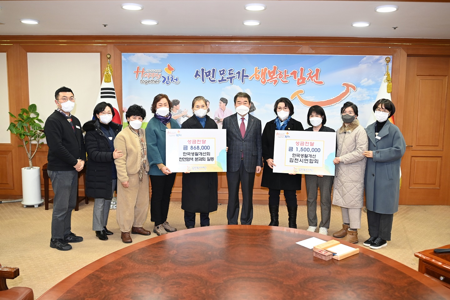 | 한국생활개선김천시연합회(회장 김지현)에서는 지난 12월 21일 이웃사랑 마음을 담은 성금 2,368천원을 「김천복지재단」에 전달했다.