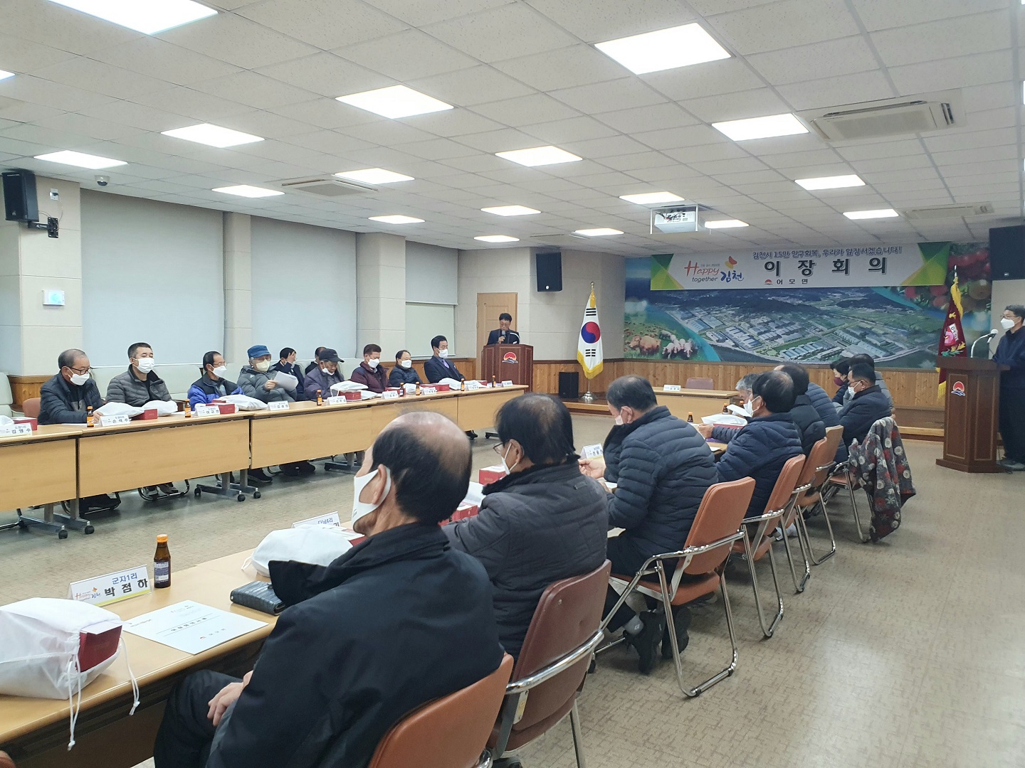 이날 회의에서는 김천시의회 진기상의원, 새김천농협 신외철 조합장, 어모면 이장협의회 김창집 회장과 이장단 30여명이 참석한 가운데 내년부터 시행하는 고향사랑기부제와 동절기 코로나19 추가접종 등 홍보사항을 안내했으며, 2부에서 진행된 송년의 밤 행사에서는 시루떡커팅 및 김창집회장의 송년사가 이어졌다.