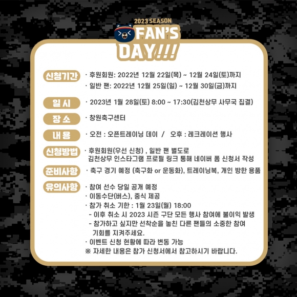 김천상무, 프로 선수단과 함께하는 2023 동계훈련 팬즈데이 참가자 모집
