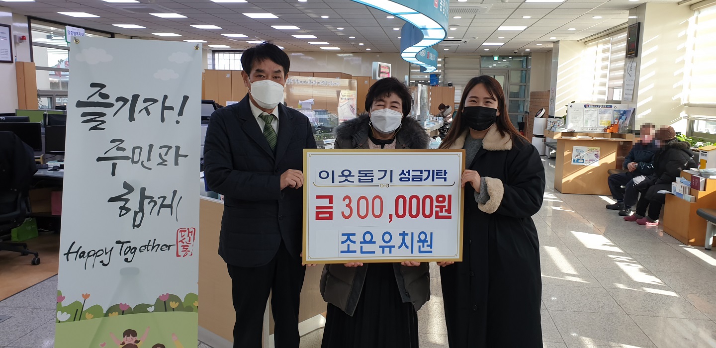 | 대신동 조은유치원(원장 노채경)은 지난 12월 22일 대신동행정복지센터를 방문하여 이웃돕기 성금 30만원을 기탁했다.