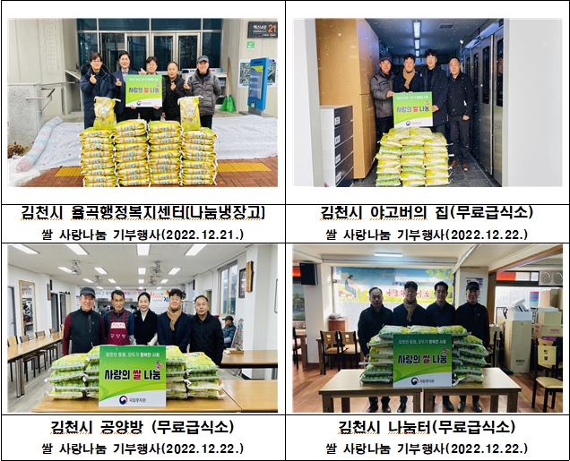 종자원은 김천 소재 본원 내에서 정부 보급종의 품질관리를 위해 매년 사후관리 시험 등을 수행하고 있으며, 이 과정에서 생산된 벼 약 1,700㎏을 도정하여 1,090㎏(109포대/10㎏)을 지역사회에 기부하여 나눔의 정을 실천하였다. 금년에 쌀을 기부한 곳은 김천시 소재 무료 급식소 3개소와 나눔 냉장고 1개소로 ‘경기 침체와 한파로 어려움을 겪고 있는 이웃들에게 작지만 조금이나마 도움이 되길 바란다’ 고 하였다.