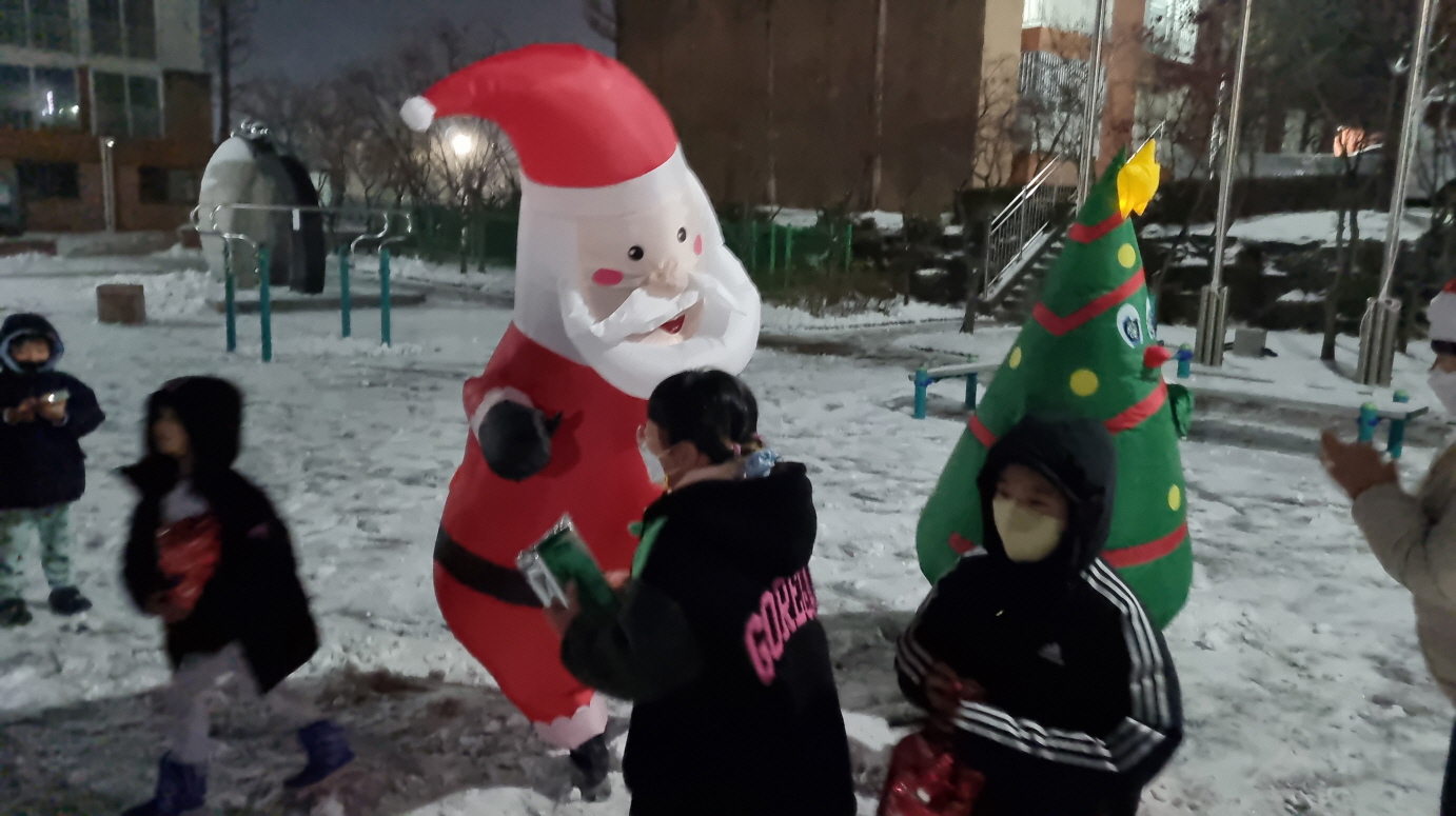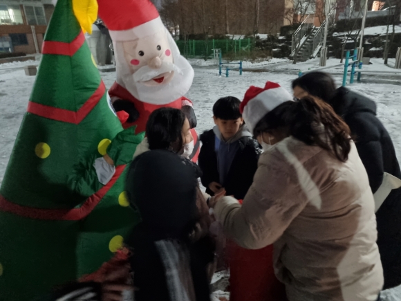 산타할아버지로 분장하여 방문한 봉사자는 “저녁시간 산타를 기다리는 아이들을 만나 눈싸움도 하고 즐거운 시간을 보내며 행복한 추억이 되었다.”고 했다.