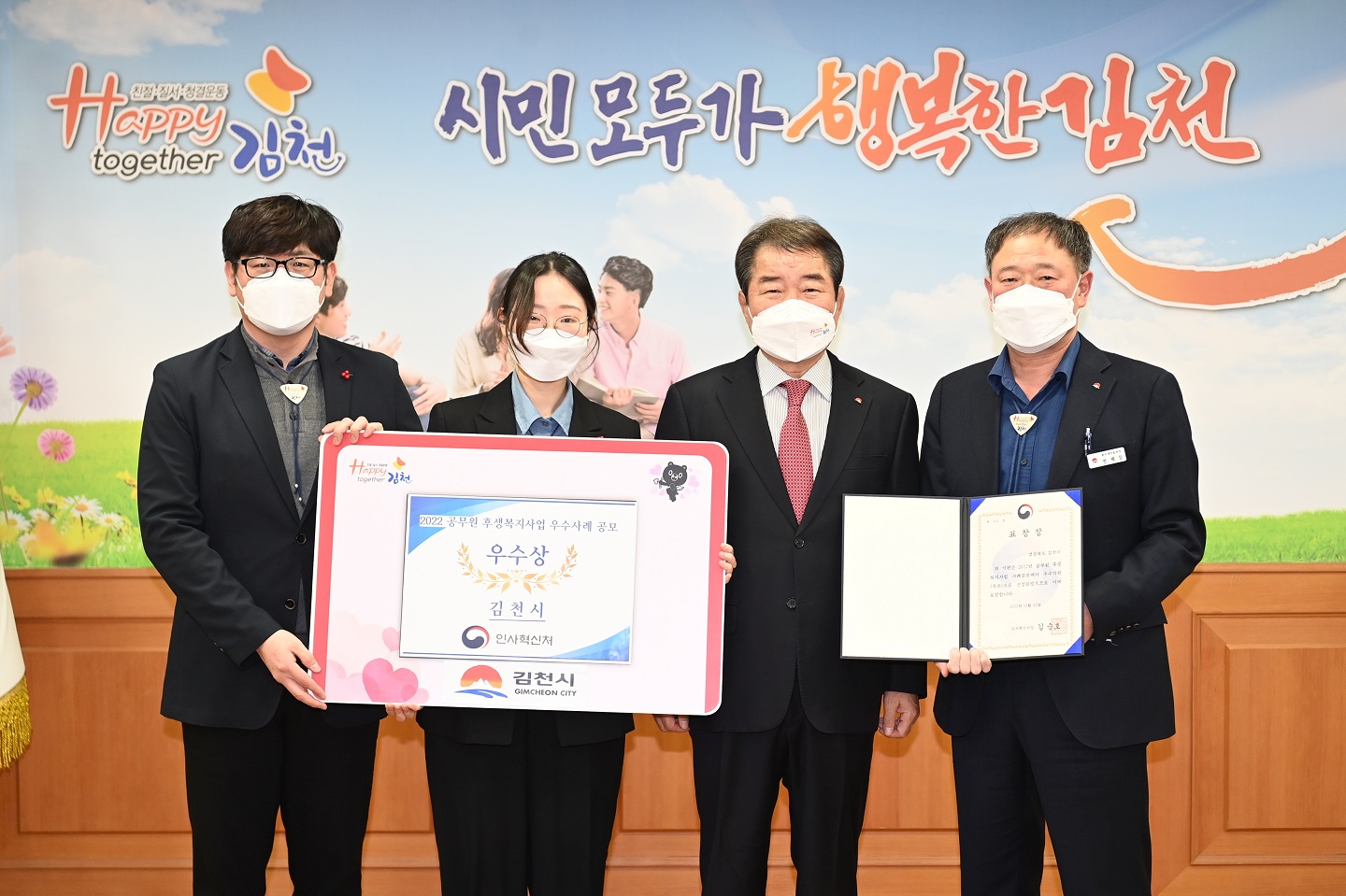 | 김천시(시장 김충섭)는 지난 12월 22일 인사혁신처에서 시행한 공무원 후생복지사업 우수사례 공모결과 우수상을 수상했다고 밝혔다.
