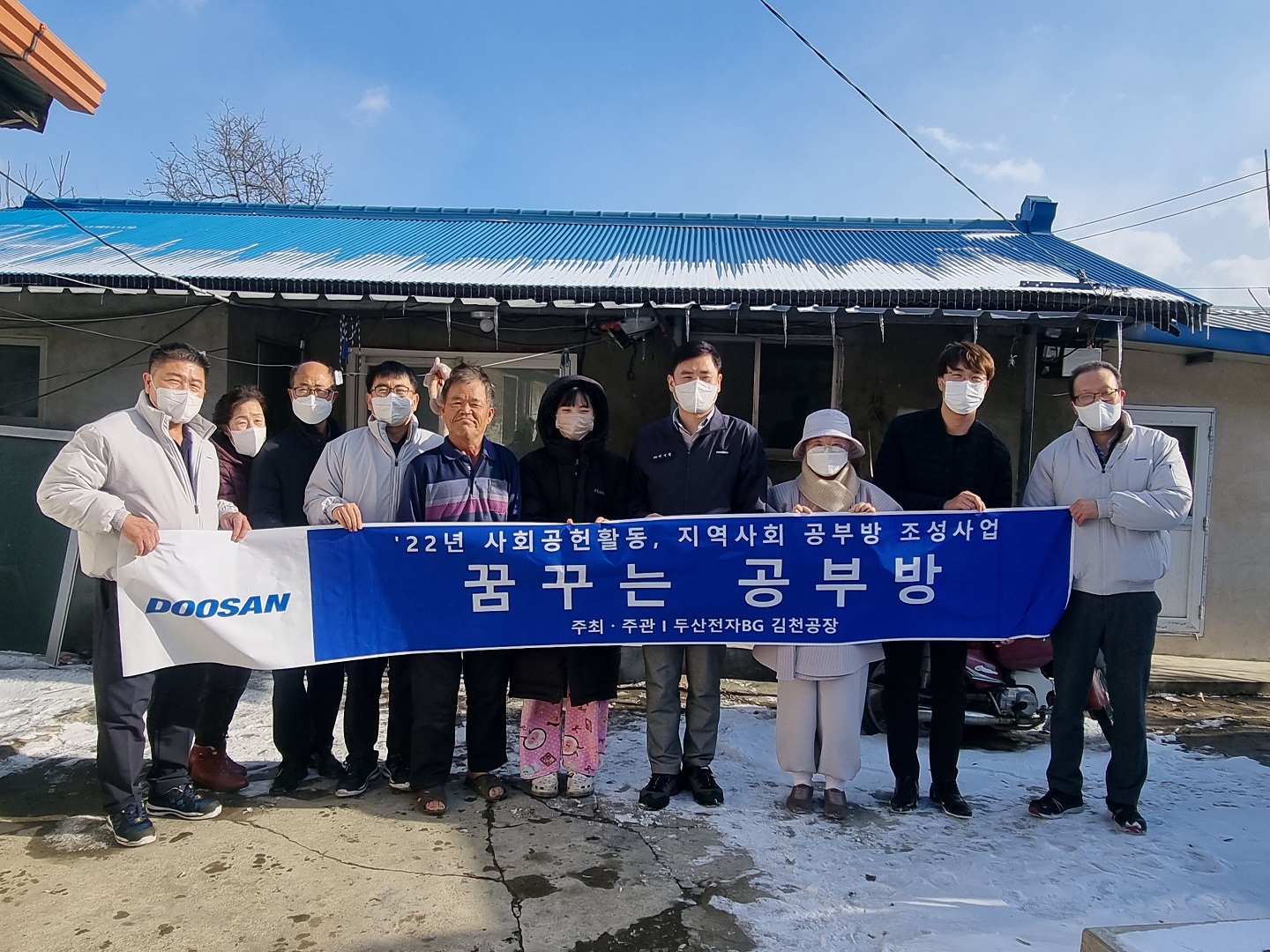 두산전자 김천공장의 `꿈꾸는 공부방'은 경제적 어려움으로 학업 여건이 제대로 갖춰지지 않은 소외계층 아이들에게 쾌적한 학습 환경을 조성해주는 사업으로 2022년 상반기에 이어 두 번째로 어려운 가정에게 공부방을 선사했다. 이번에 진행된 ‘꿈꾸는 공부방’은 두산전자 김천공장의 요청으로 김천시지역사회보장협의체와 김천시가족센터가 연계하여 추진했다. 수혜가구는 초등학생 3명을 포함한 5인 가구로서 주택이 매우 노후하고 공부방도 없어 학습하기에 열악한 환경의 가정이었다. 이에 꿈꾸는 공부방을 만들기 위해 벽지‧장판‧LED등을 교체하고 책상과 옷장 등을 지원했다.