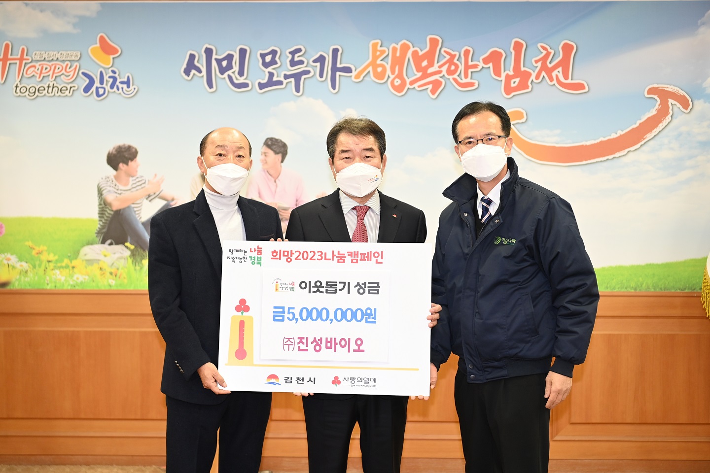 김충섭 김천시장은 “어려운 상황 속에서도 이웃 사랑에 솔선수범하여 실천해주시는 ㈜진성바이오에 깊은 감사를 드린다. 전달받은 성금은 어려운 이웃을 위해 꼭 필요한 곳에 잘 사용하도록 하겠다.”고 전했다.