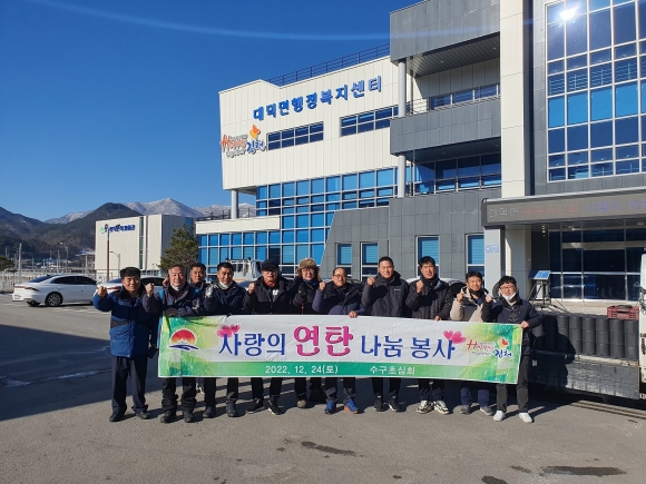 | 수구초심회(회장 정기창)는 한파가 몰아치는 2022년 겨울, 주민들이 따뜻한 겨울을 날 수 있도록 지난 12월 24일(토) 관내 이웃 6가구에 연탄 3,000장을 전달했다. 정기창 회장은 대덕면 출신의 젊은 출향인들이 고향을 잊지 않고, 사랑이 넘치는 지역 만들기에 활발하게 참여하고 있으며, 고향 사랑 실천에 노력하고 있다고 했다.