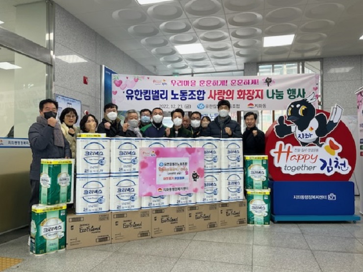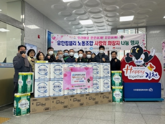 | 김천시 지좌동행정복지센터(동장 남상연)에 지난 12월 23일 유한킴벌리 노동조합(위원장 채용석)에서 어려운 이웃을 위해 두루마리 70개와 각티슈 20팩(총200만원 상당)을 전달해 지역사회를 따뜻하게 만들고 있다.
