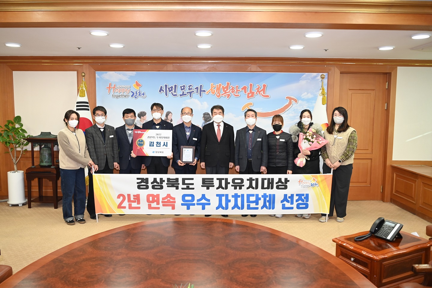 경상북도 투자유치 대상은 도내 23개 시군을 대상으로 MOU 체결 및 투자유치실적, 투자기업 사후관리, 투자유치 활성화, 도정협력 등을 종합적으로 평가한 것으로, 투자유치 성과를 위해 노력한 공로를 인정받아 김천시가 2년 연속 우수기관으로 선정되었다.