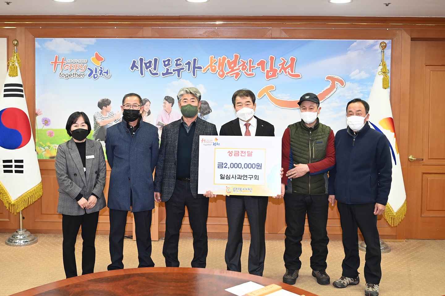 | 김천시는 사과 재배 선도농가 모임인 일심사과연구회(회장 임환규)에서 지난 12월 27일 김천시청을 방문해 지역의 어려운 이웃과 희망을 나누고자 불우이웃 돕기 성금 200만 원을 기탁했다고 밝혔다.