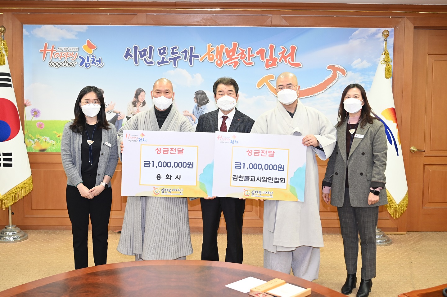 김충섭 시장은 “김천불교사암연합회와 용화사는 지난해는 물론, 올해도 여러 차례 어려운 이웃들을 위해 성금을 기부해 주셨다.”라며 “대승의 보살정신을 몸소 실천하며 꾸준히 이웃사랑 실천해 주셔서 감사드린다. 기부해 주신 성금은 어려운 이웃의 복지 증진을 위해 쓰일 수 있도록 하겠다.”라며 감사의 말을 전했다.