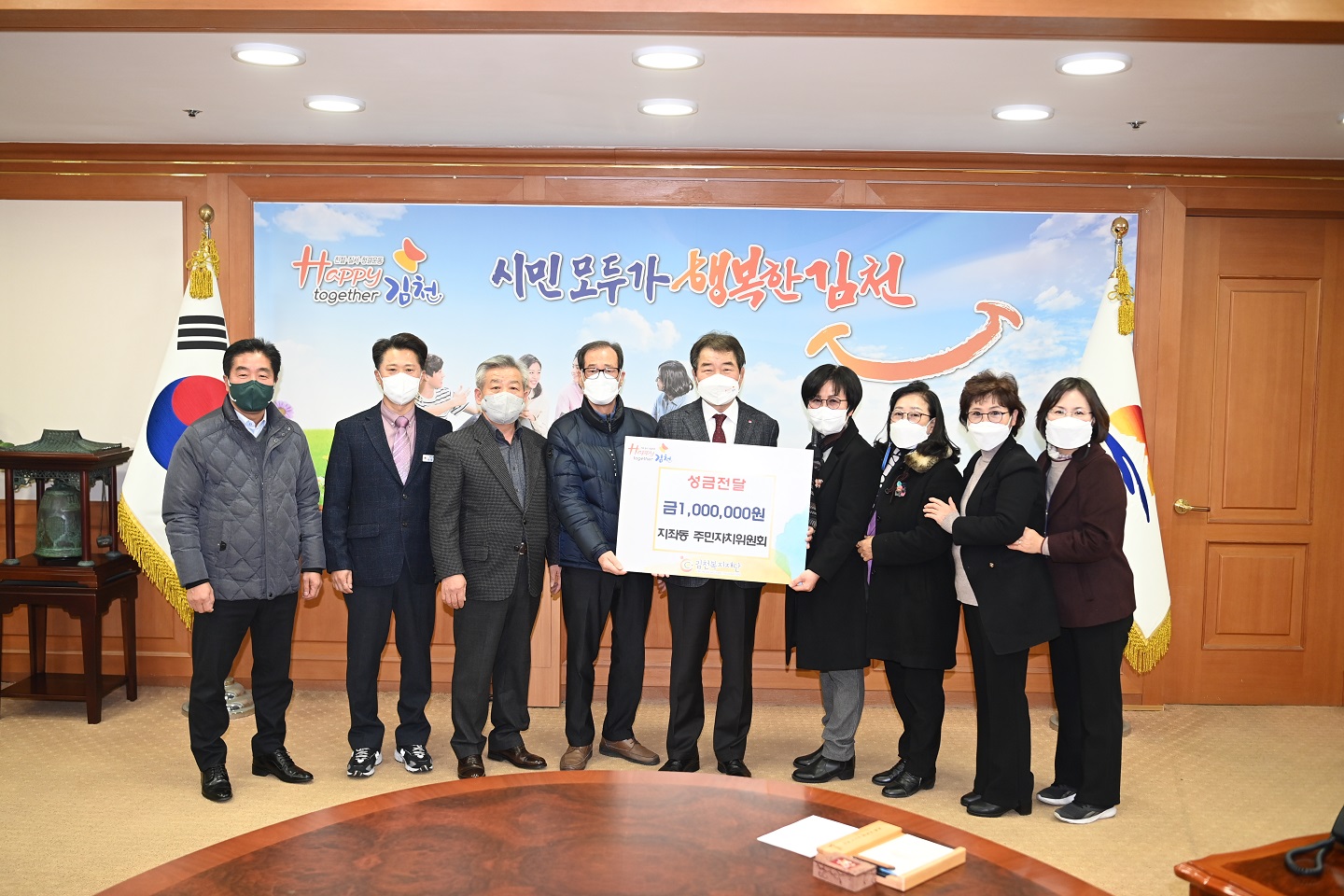 | 지좌동주민자치위원회(위원장 김기옥)에서는 12월 28일 김천시청 접견실에서 위원 및 지좌동 단체장 등이 참석한 가운데 이웃돕기 성금 100만원을 김천복지재단에 기탁했다.