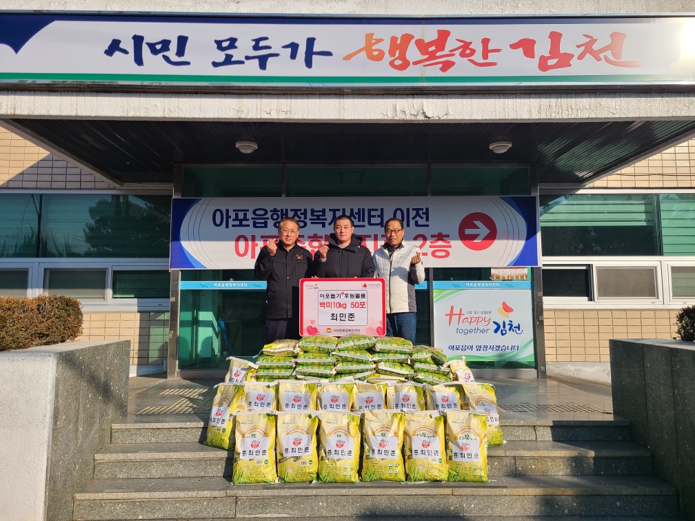 | 김천시 아포읍 봉산2리 후계영농경영인 최민준 씨는 지난 12월 29일, 아포읍 행정복지센터를 방문하여 관내 어려운 이웃에게 전달해달라며 백미 10kg 50포를 기탁했다.