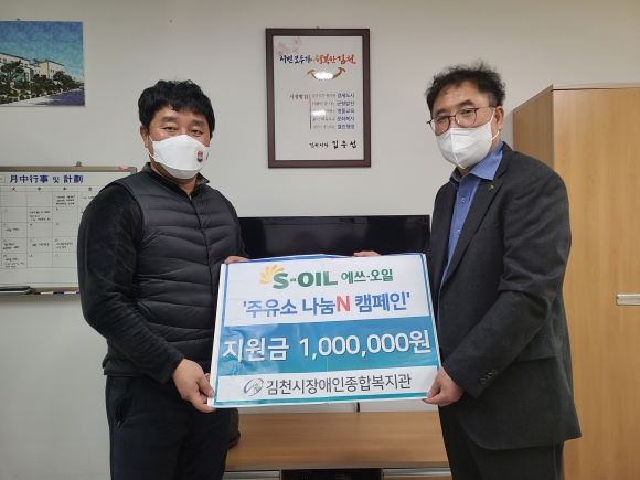 | 김천시장애인종합복지관(관장 안민)은 12월 28일 한국사회복지협의회에서 진행한 「주유소 나눔N 캠페인」을 통해 에쓰-오일 한마음 주유소(대표 전해수)로 부터 100만원 주유권을 후원받았다.