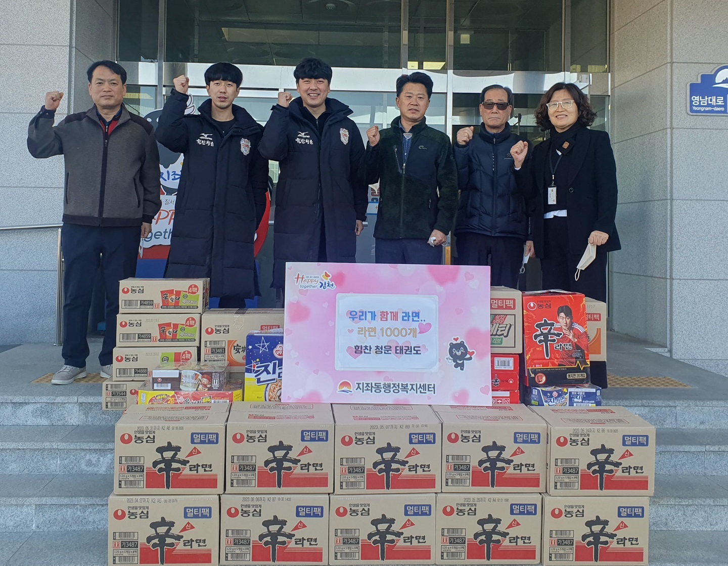 | 김천시 지좌동에 소재한 ‘힘찬 청운 태권도’(관장 강영현)는 1월 3일 계묘년 새해를 맞아 어려운 이웃에 따뜻한 온기를 나누고자 라면 1,000개를 지좌동행정복지센터(동장 남상연)를 방문하여 기부했다.