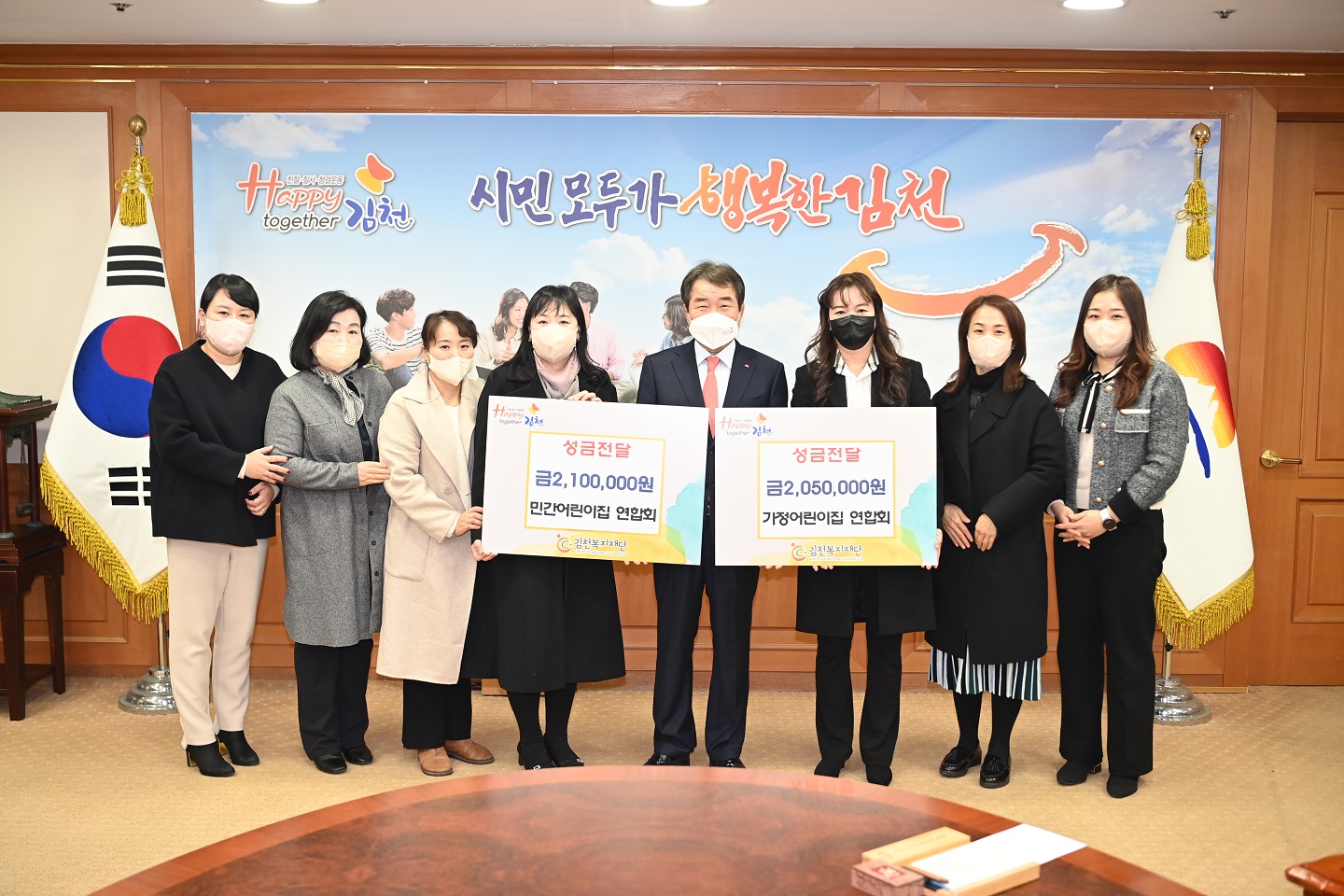 기탁한 성금은 민간․가정어린이집 연합회 회장과 회원들이 모은 성금으로 김천시 민간․가정어린이집 연합회는 매년 이웃돕기 성금을 기탁해오고 있어 지역 사회의 귀감이 되고 있다.