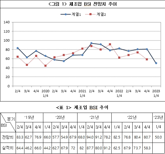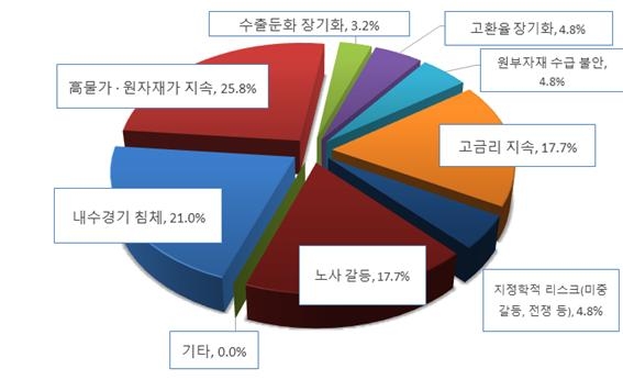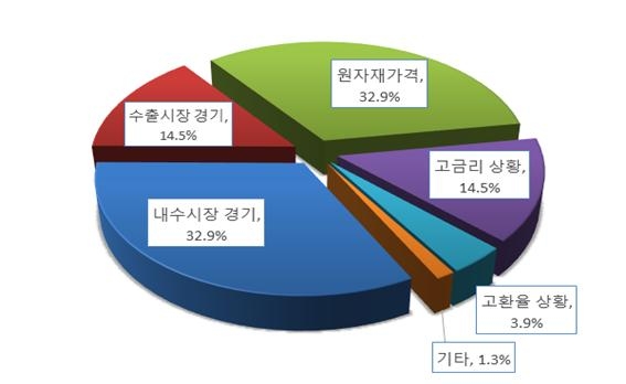 2023년 1/4분기 우리 기업들이 예상하는 경기전망은 지난 분기보다 ‘호전’될 것이라고 답한 기업보다 ‘악화’될 것이라고 답한 기업이 더 많았으며, 그 원인을 ‘원자재 가격 상승’, ‘고금리’, ‘내수 침체’ 등을 주된 이유로 꼽았다.