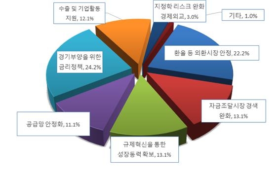 이러한 리스크를 관리하기 위해 정부가 역점을 둬야 할 과제는 무엇인가에 대한 물음에는 ‘경기부양을 위한 금리정책’(24.3%), ‘환율 등 외환시장 안정’(22.2%), ‘자금시장조달경색 완화’(13.1%), ‘규제혁신을 통한 성장동력 확보’(13.1%), ‘수출 및 기업 활동 지원’(12.1%), ‘공급망 안전화’(11.1%), ‘경제 외교 및 기타’(4.1%) 등으로 답했다.