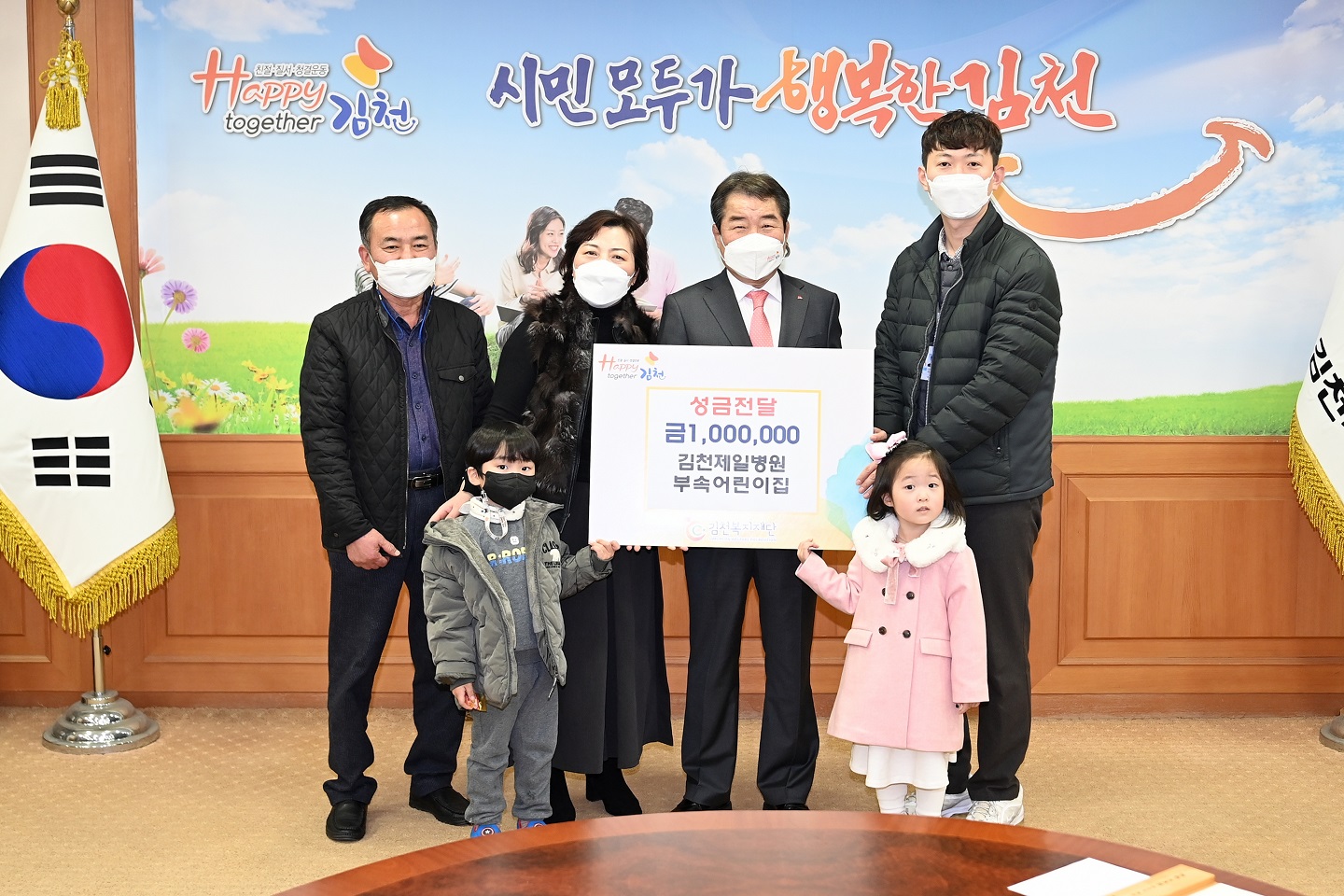 이번 성금은 김천제일병원부속어린이집 원아들이 부모님들에게 받은 용돈을 1년 동안 모아서 마련된 성금으로 원아대표 2명이 직접 전달해 훈훈한 분위기를 자아냈다.