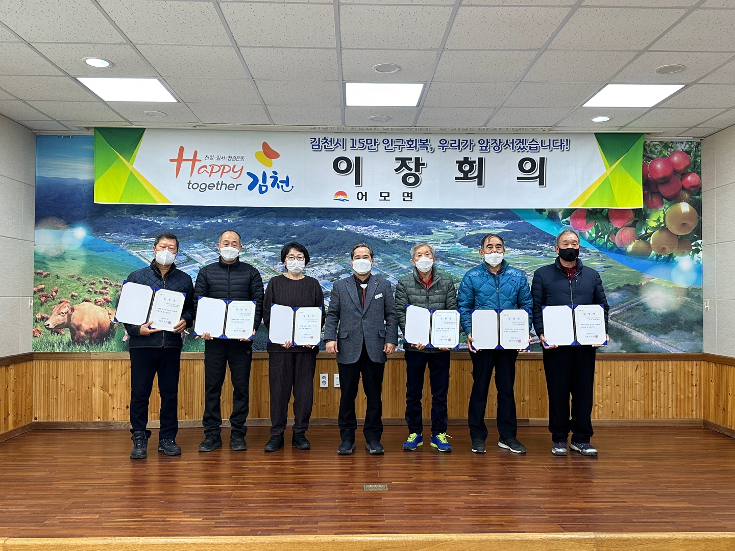 이날 회의에서는 한 해 동안 마을일을 맡아 행정기관과 주민의 가교 역할을 해줄 신임 및 연임 마을이장에게 임명장을 수여하고, 권영춘 면장의 신임인사 및 각종 지원 사업 등 현안사항을 전달했다. 어모면 이장협의회는 중왕2리 이권중, 남산2리 김동환, 능치2리 박병숙, 은기1리 김홍연, 은기3리 최인관, 동좌2리 박안식 이장이 신임되어 앞으로 3년간 이장직을 맡게 되었고, 이장협의회장으로는 어모면 능치1리 박세현 이장이 맡아 이끌게 된다.