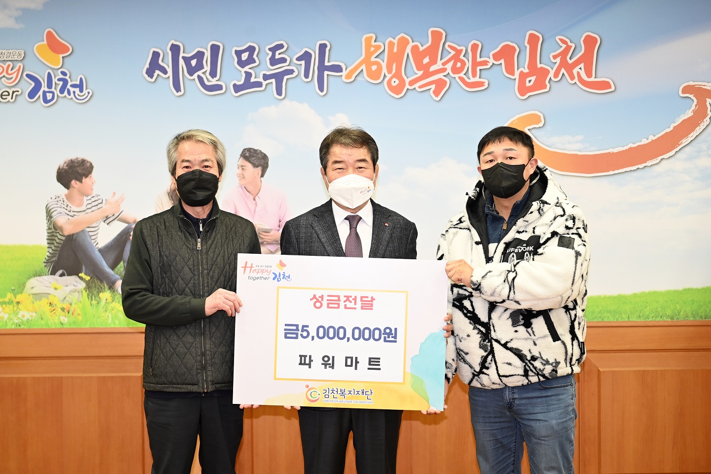 김천 부곡동에 소재한 파워마트는 김천에서 창출한 이윤을 지역사회에 환원하고자 매년 꾸준하게 기부를 이어오고 있으며, 올해도 어김없이 어려운 이웃들을 위해 써달라며 김천복지재단을 찾아주었다.