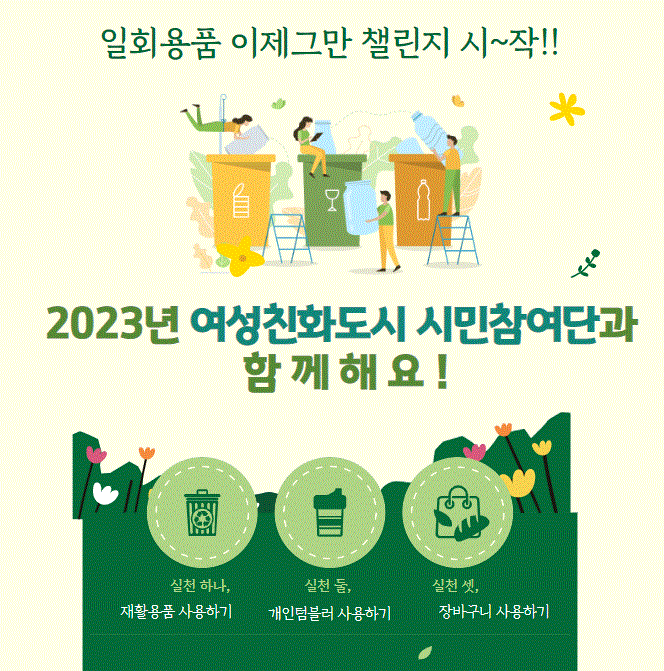 이번 『일회용품 이제그만 챌린지』는 시민참여단의 새해 첫 활동으로 일상에서 많이 쓰는 종이컵 대신 텀블러 사용을 하고, 인증 사진을 여성친화도시 시민참여단 SNS에 올려 다음 실천자를 지목하여 누구나 참여할 수 있는 챌린지이다.