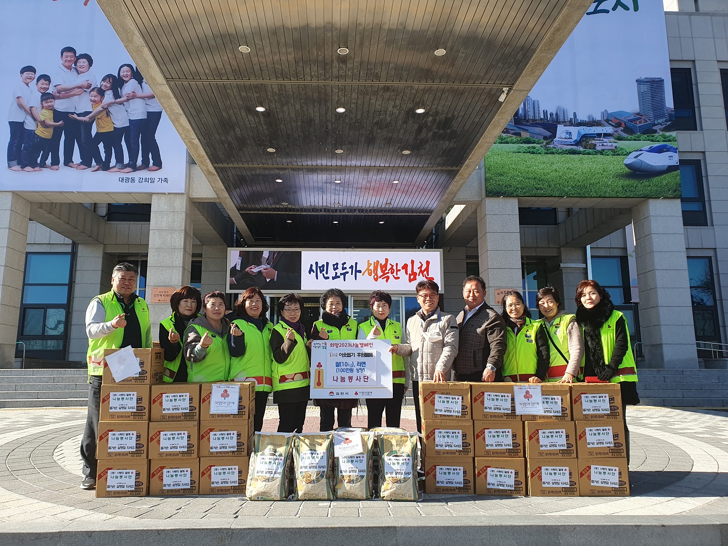 | 김천시(시장 김충섭)는 1월 17일 사랑의 열매 나눔봉사단(단장 박유순)으로부터 백미(10kg)와 라면 등 싯가 100만원 상당의 물품을 전달받았다고 밝혔다.