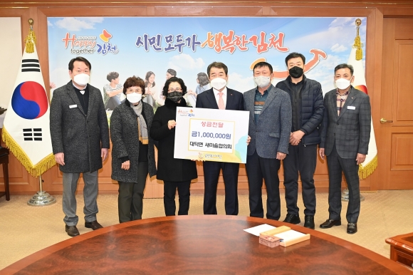 | 대덕면 새마을협의회(협의회장 정재식, 부녀회장 이연옥)에서는 지난 1월 16일 김천시청 접견실에서 사랑의 이웃돕기 성금 100만원을 김천복지재단에 기탁했다.
