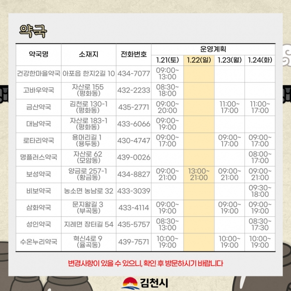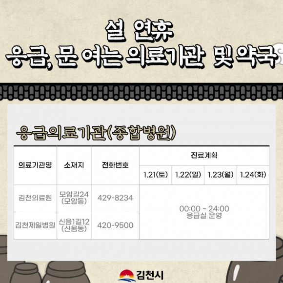 | 김천시(시장 김충섭)는 설 명절 연휴기간인 1월 21일부터 24일까지 응급환자 및 일반환자 진료 공백을 최소화하기 위해 김천시 의사회, 약사회 등과 협조하여 응급의료체계를 구축한다고 밝혔다.