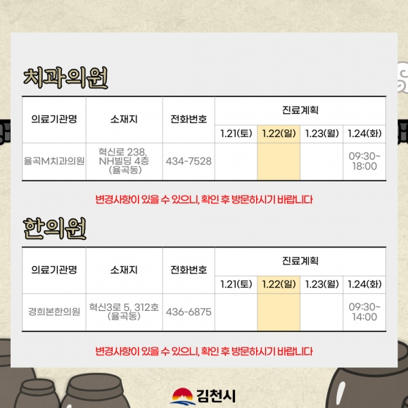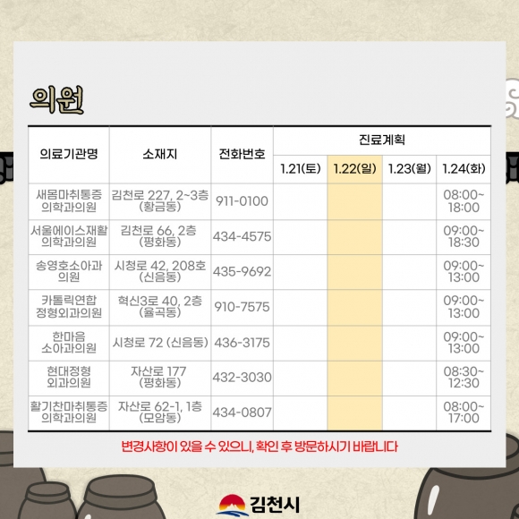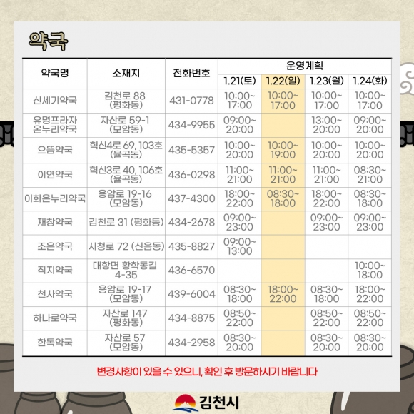설 연휴기간 중 문 여는 의료기관 및 약국에 대한 정보는 보건복지콜센터(129), 119구급상황관리센터(119), 경상북도 콜센터(120), 김천시보건소(433-4000)로 연락하거나 김천시청·김천시보건소 홈페이지, 응급의료포털(www.e-gen.or.kr), 스마트폰 앱(응급의료정보제공), 포털사이트에서 ‘명절 진료’로 검색하면 안내받을 수 있다.